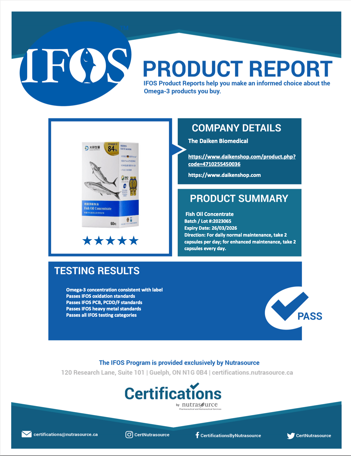 大研生醫的魚油產品,從德國頂級魚油、EPA魚油,以及兒童魚油產品,都能在IFOS網站中都可以查詢到通過認證的合格證書。