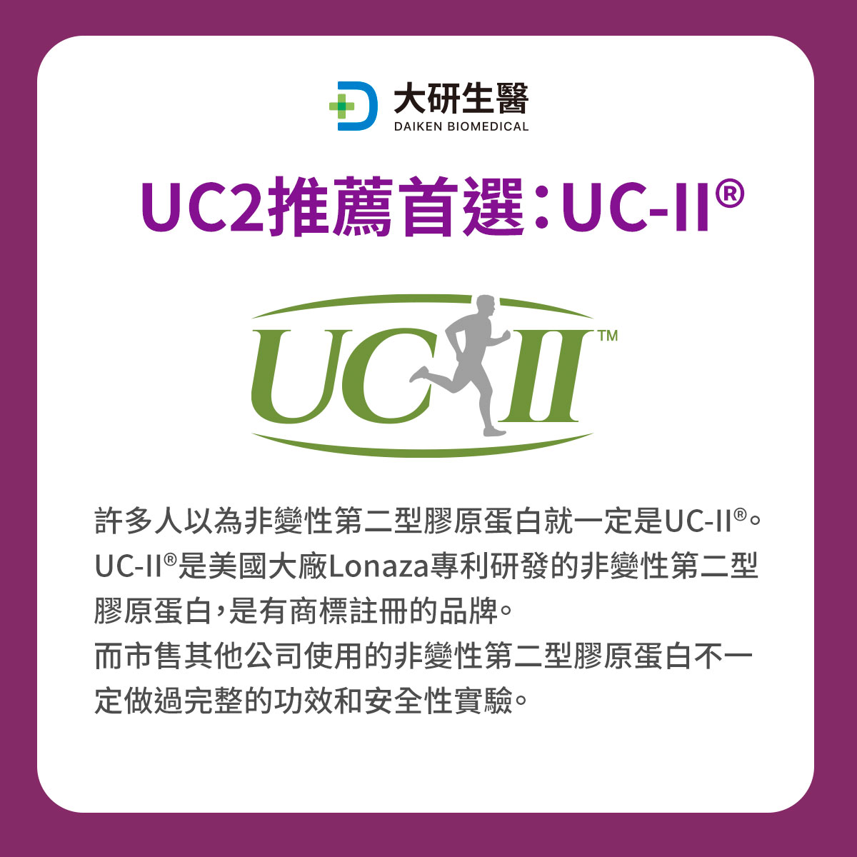 那麼,非變性二型膠原蛋白就都是UC2嗎?錯!在透過UC2補充靈活度當紅的風潮下,許多消費者會誤以為非變性第二型膠原蛋白就一定是UC-II®,其實UC-II®是美國大廠Lonaza所專利研發的非變性第二型膠原蛋白,在市場上是有商標註冊的品牌,然而在市售市場上也有許多其他公司的非變性第二型膠原蛋白在使用,未做過完整的功效和安全性實驗,因此品質參差不齊,功效程度當然也未如期所願。